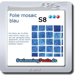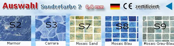 Wählen Sie oben über dem Preis, ihre gewünschte Folienfarbe und die gewünschte Poolfolien Größe aus. Es stehen 5 verschiedene Farben zur Auswahl: Marmor, Carrara, Mosaik Sand, Mosaik Blau und Mosaik Grau-Blau