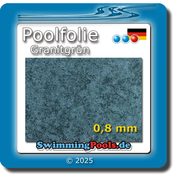 Schwimmbadfolie 0,8 mm für Ovalpools in verschiedenen Farben für den Wand und Bodenbereich. Sie können bei uns aber auch 2 verschiedene Farben miteinander kombinieren und so Ihre individuelle Poolfolie selber zusammen. Die Poolfolien sind sehr widerstandsfähig und dank des dauerelastischen Materials sind auch bei hohen Minustemperaturen keine Frostschäden zu befürchten. Unsere Folien wurden eingehend getestet und erfüllen sogar die europäische Norm für die Sicherheit von Kinderspielzeug. Dabei wurden die geforderten Grenzwerte nicht nur eingehalten sondern um ein Vielfaches unterschritten. Sie sind geprüft nach KSW, CE-zertifiziert und werden nach hohen Qualitäts- und Umweltstandards in Deutschland hergestellt.