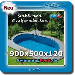 Das Stahlwandbecken 900 x 500 x 120 oval, hat ein Wasservolumen von ca. 45000 Litern. Dieser Pool 9 x 5 x 1,2 m ist feuerverzinkt, schutzlackiert und außen zusätzlich mit Kunststoff beschichtet. Dieser große Stahlwandpool ist nur für den Einbau ins Erdreich geeignet und man muss an den Seitenwänden Stützmauern erstellen, möglichst auf einer Bodenplatte aus Beton. Die Rundungen müssten dann später nach Aufstellung und Befüllung des Pools, zusätzlich mit Magerbeton hinterfüllt werden. Die Poolfolie ist bei diesem Swimmingpool 0,6 oder 0,8 mm stark ( je nach Auswahl ), in einem sehr schönen adriablau. Sie ist aus PVC gefertigt und ist frostbeständig, UV-stabilisiert und CE-zertifiziert. Bei der Montage ist bei diesem Stahlwandbecken oval, kein Verschrauben mehr nötig, sondern es wird durch ein mitgeliefertes Alu Steckprofil verbunden. Weiterhin wird ein stabiler Handlauf und Kunststoff Profile für den Boden mitgeliefert. Ein sehr hochwertiger robuster Swimmingpool, produziert in Deutschland. Die Ausschnitte für den Skimmer und der Einlaufdüse, sind bei diesem ovalen Stahlwandbecken oval 900 x 500 x 120 cm auswählbar.