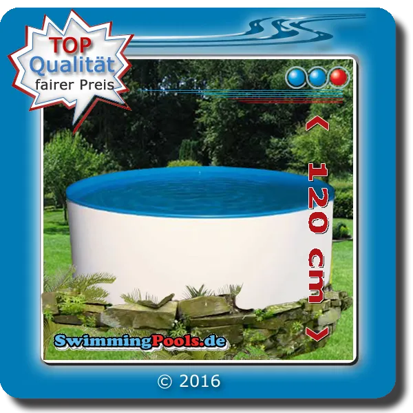 Stahlwand Pool rund 400 x 120 cm kann frei aufgestellt oder auch komplett eingebaut werden. Die Schwimmbadfolie ist bei diesem Swimmingpool 0,6 mm oder 0,8 mm stark (je nach Auswahl ) und in einem sehr schönen adriablau, aus PVC gefertigt. Die Poolfolie ist frostbeständig, UV-stabilisiert und CE-zertifiziert. Der verzinkte Stahlmantel ( 0,6 mm ) ist schutzlackiert und außen zusätzlich kunststoffbeschichtet. Damit ist eine lange Haltbarkeit gewährleistet. Bei der Montage ist bei diesem runden Stahlwandbecken kein Verschrauben mehr nötig, sondern er wird durch ein mitgeliefertes Alu Steckprofil verbunden. Weiterhin wird bei diesem runden Stahlwandbecken ein Handlauf und Kunststoff Profile für den Boden mitgeliefert. Alles in allem, ein sehr hoch qualitatives robustes Schwimmbecken, made in Germany. Die Ausschnitte für den Skimmer und der Einlaufdüse kann man bei diesem runden Stahlwandbecken 400 x 120 cm ohne Aufpreis mit auswählen.