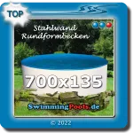 Dieses Achtform Stahlwandbecken 725 x 460 x 150 ist feuerverzinkt, schutzlackiert und von außen zusätzlich kunststoffbeschichtet. Man kann den Swimmingpool durch die mitgelieferte Stahlkonstruktion, teilversenken ( mindestens 50 cm ) oder auch komplett einbauen. Daher sind diese Stahlwandbecken sehr beliebt, da man sich beim Einbau die Stützmauern wie beim Ovalpool, sparen kann. Beim Einbau ist immer eine Magerbeton Hinterfüllung und eine Bodenplatte aus Beton empfohlen. Die Dicke des Stahlmantels beträgt bei diesem Achtform Stahlwandbecken 0,8 mm. Zu diesem Achtform Swimmingpool wird eine Stützkonstruktion, sowie Kunststoff Profile für den Boden und den Handlauf mitgeliefert. Die Ausschnitte für Skimmer und Einlaufdüse, kann man ohne Aufpreis mit auswählen.