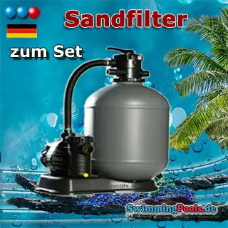 Zum Lieferumfang gehört selbstverständlich zu dem Achtform Stahlwandpool Set noch ein Skimmer-Set ( inklusive Skimmerkorb, einer Einlaufdüse und einer Poolsauger Anschlußplatte usw. ). Das Skimmerpaket ist selbstverständlich kompatibel mit den schon im Stahlmantel vorgestanzten Löchern. Weiterhin ist im Set, der passende Poolschlauch mit Schlauchklemmen, ein unverottbares Poolvlies 400 g/m ² zur Unterlage und der benötigte Filtersand enthalten.